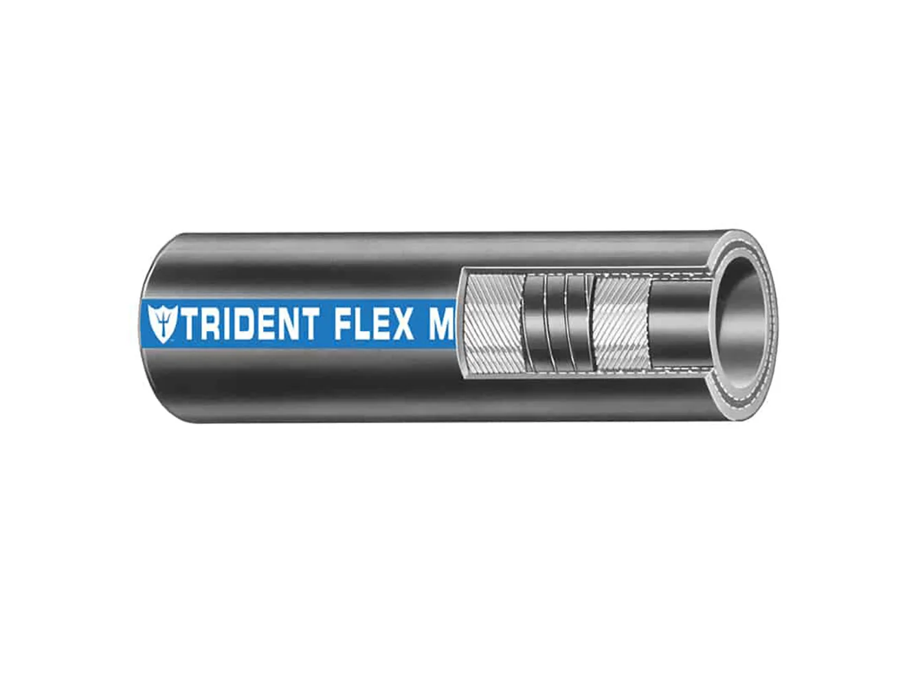 Trident Flex wet exhaust hose for longer bent connections. In smaller I.D.’s for engine intake, critical water, drain, scupper bilge & sanitation uses. Resists heat, ozone, exhaust, panting, and collapse. Black High Temp EDPM Rubber 250°F (121°C) Max.