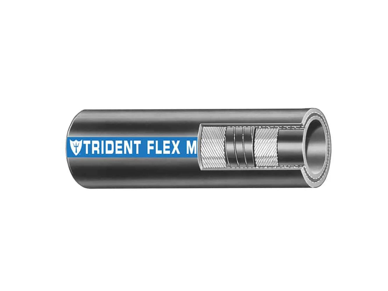 Trident Flex wet exhaust hose for longer bent connections. In smaller I.D.s for engine intake, critical water, drain, scupper bilge & sanitation uses. Resists heat, ozone, exhaust, panting, and collapse. Black High Temp EDPM Rubber 250°F (121°C) Max.