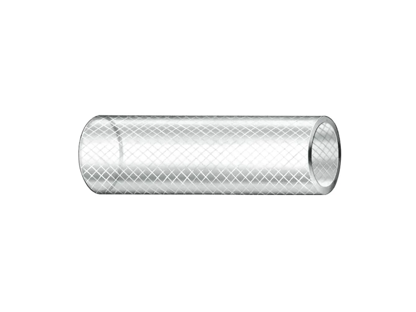 Clear FDA-grade PVC hose with heavy-duty nylon reinforcement provides excellent flexibility and bend radius.