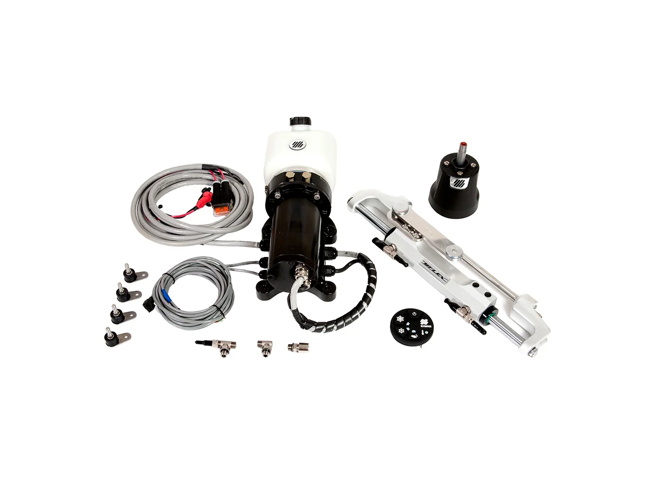 The Uflex Front Mount Helm Single Cylinder Outboard MasterDrive™ Steering System eliminates torque at the steering wheel. Three different selectable power levels give the boater the desired feeling on the wheel. Automatically reverts to manual mode in case of power loss. The system always running permits immediate access to control in any sea conditions.