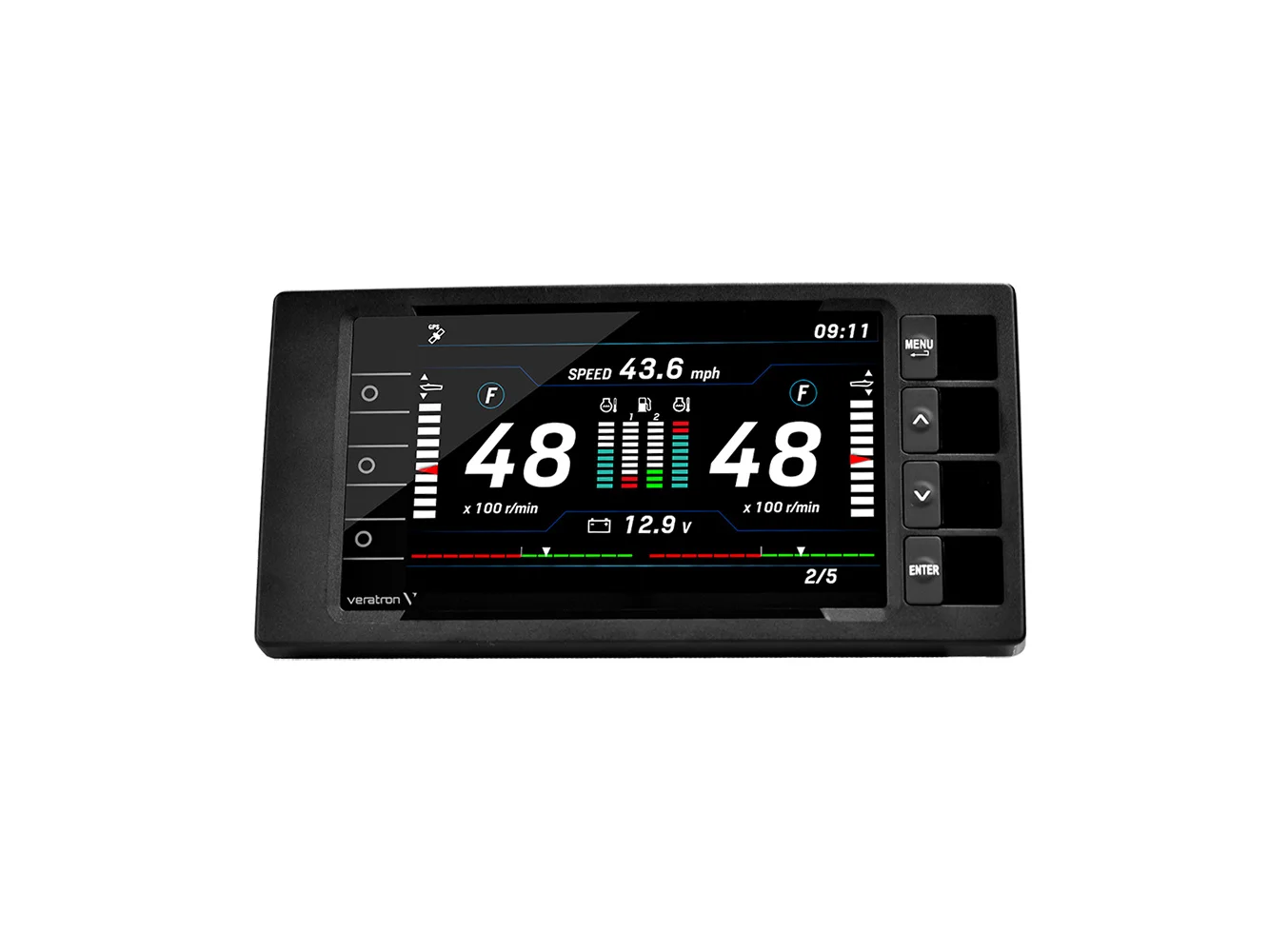 The new OceanLink® 7″ multifunction TFT Display features a 24-bit/16 m colors optically bonded display with transmissive layer technology for perfect readability even in direct sunlight. The TFT Display shows and distributes a wide array of data received from NMEA 2000® and J1939 CAN Bus systems and analog sensors directly connected to the display. Users can customize up to 40 data pages with single, double, treble, or quad grid layouts.