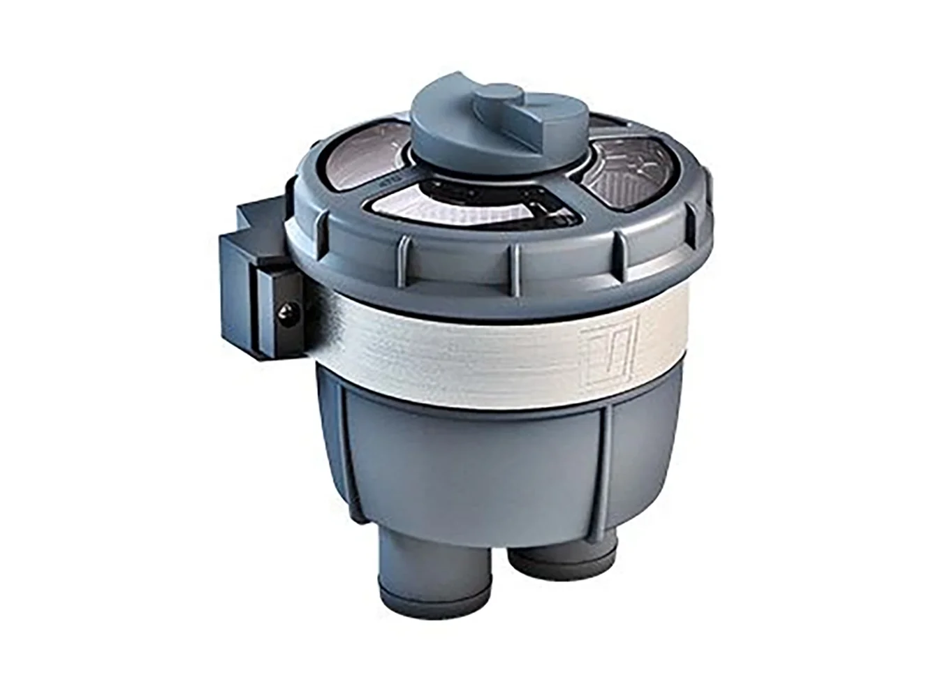 The cover of the water strainer type FTR470 is transparent, allowing easy inspection for blockages. It is removable by simply unscrewing a single central knob. The strainer can be easily mounted using the separate wall bracket and can be rotated 360° to align the hose connections. The polished stainless steel mounting bracket clamps it securely in place.