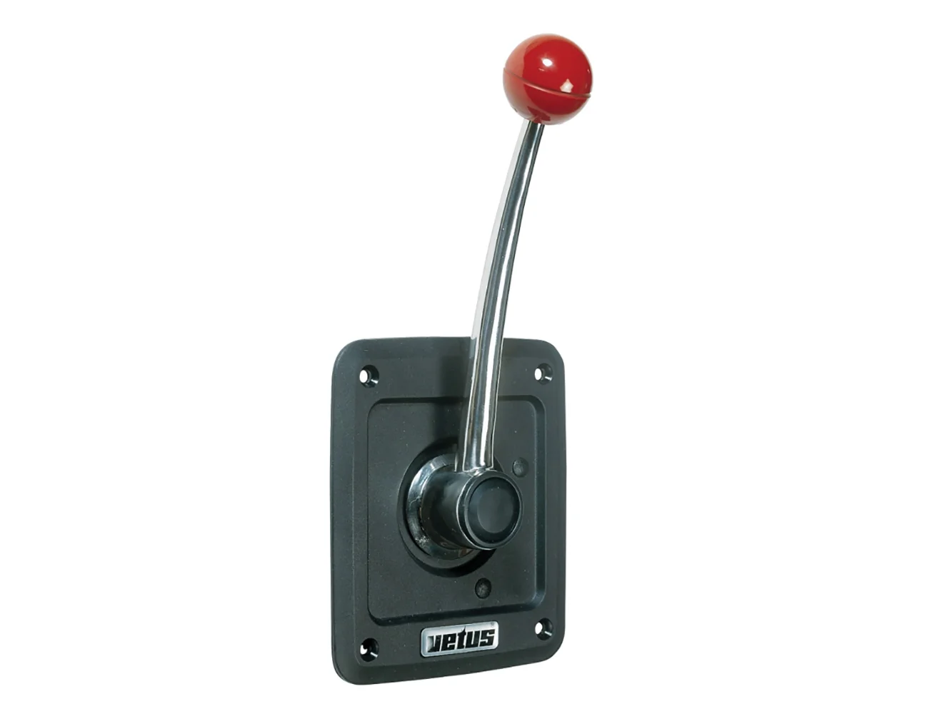 VETUS single lever remote control for side mounting, with stainless steel (AISI 316) handle, black plastic housing and red knob. With neutral safety switch.
