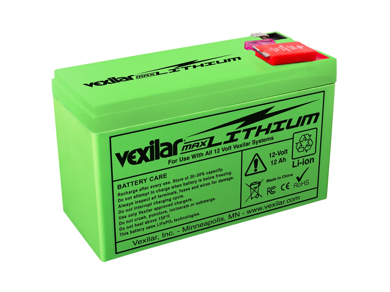 Lightweight and powerful, the V-200L 12 Volt, 12 amp-hour Vexilar MAX Lithium battery has been designed to replace any current Vexilar Flasher/Pack battery and may still allow the use of the 1 amp, fully-automatic Vexilar battery charger or the recommended new V-420L rapid charger.