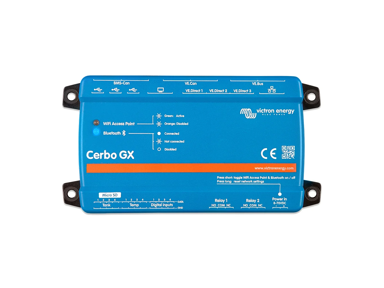 This communication center allows users to always have perfect control over the system from wherever they are and maximizes its performance. Connect through the Victron Remote Management (VRM) portal, or access directly, using the separate GX Touch 50, an MFD, or Victron’s VictronConnect app thanks to its added Bluetooth capability. This latest addition to the GX range combines all the best of connectivity, redefining smart power solutions in every way.