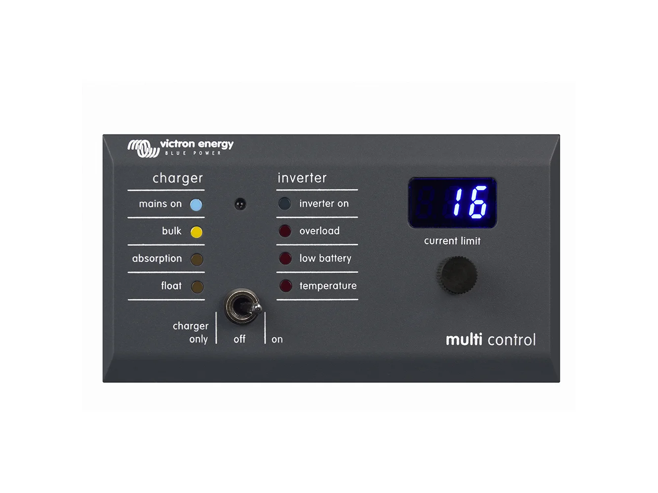 The Digital Multi Control is used to remotely view and adjust AC input currents, and turn on and off the Multi or Quattro. It is designed to integrate cleanly with your boat, vehicle or house system control panel.