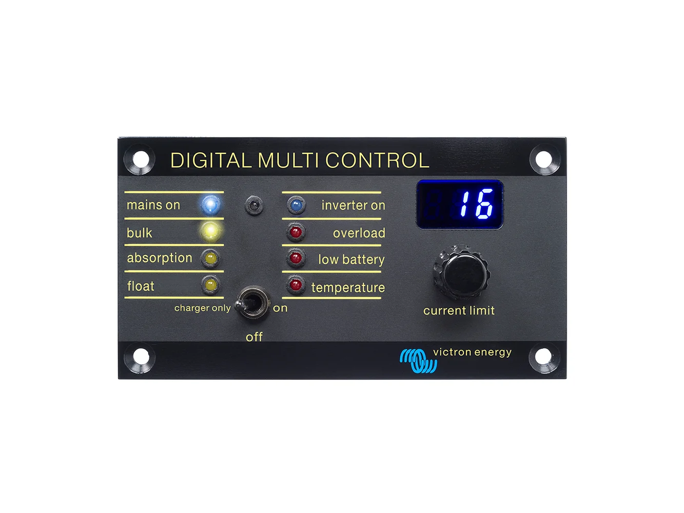 This panel is intended both for Multis and Quattros. It allows PowerControl and PowerAssist current limit setting for two AC sources: a generator and shore side current for example. Setting range: up to 200 Amps. The brightness of the LEDs is automatically reduced during night time.