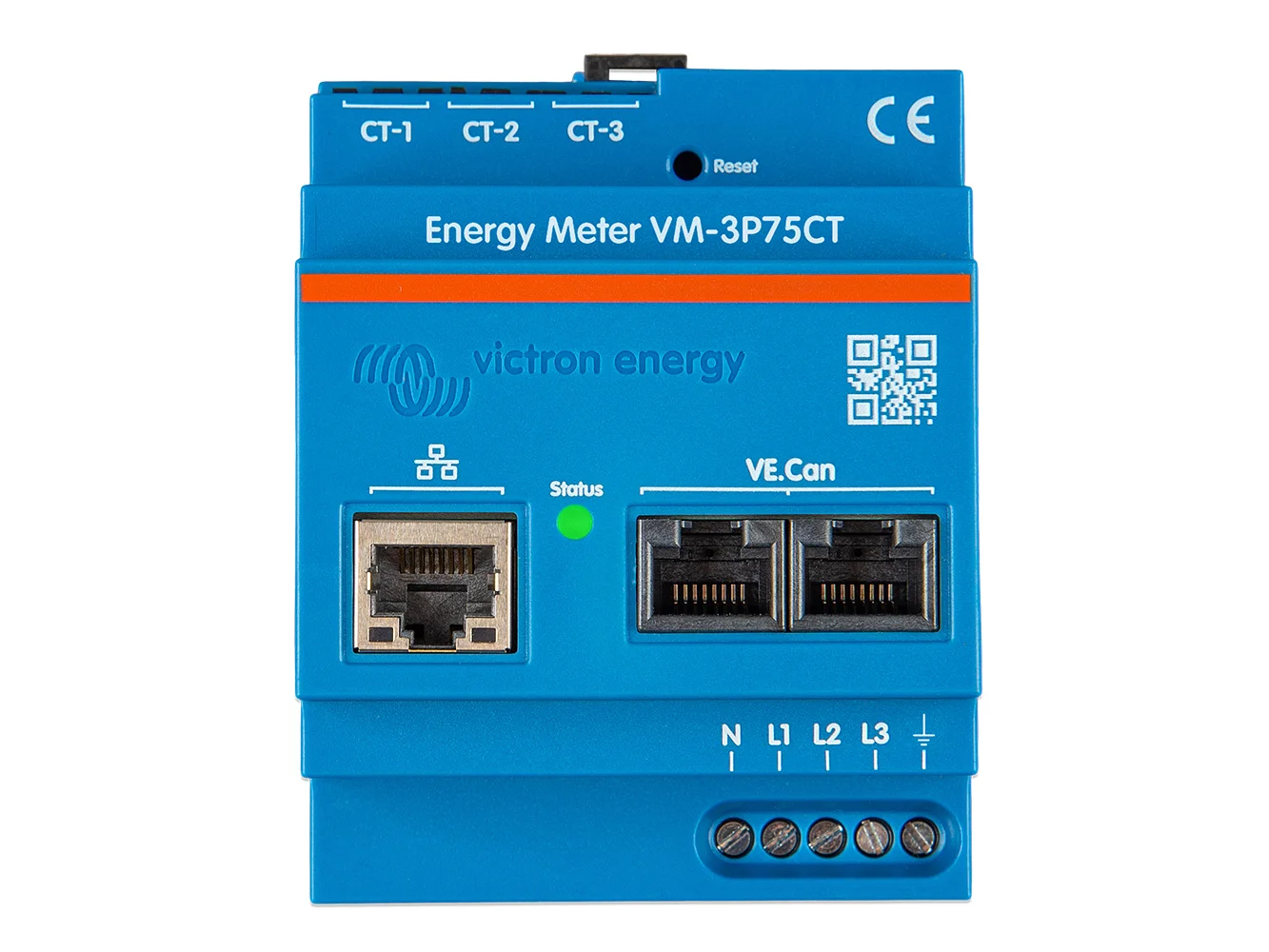 The Victron VM-3P75CT energy meter is a standard device to measure the power and energy of single- and three-phase applications and calculates each phase's power values and broadcasts this over VE.Can or Ethernet with a high rate. It has built-in Ethernet and VE.Can ports for connecting to a GX device and the split-core current transformers enable easy and quick installation without modifying existing wiring.