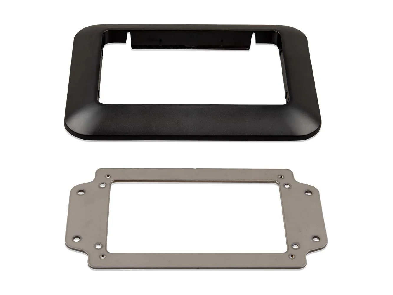 This adapter is designed to easily replace the CCGX display with the newer GX Touch. Contents of the packaging are the metal bracket, the plastic bezel, and four mounting screws.