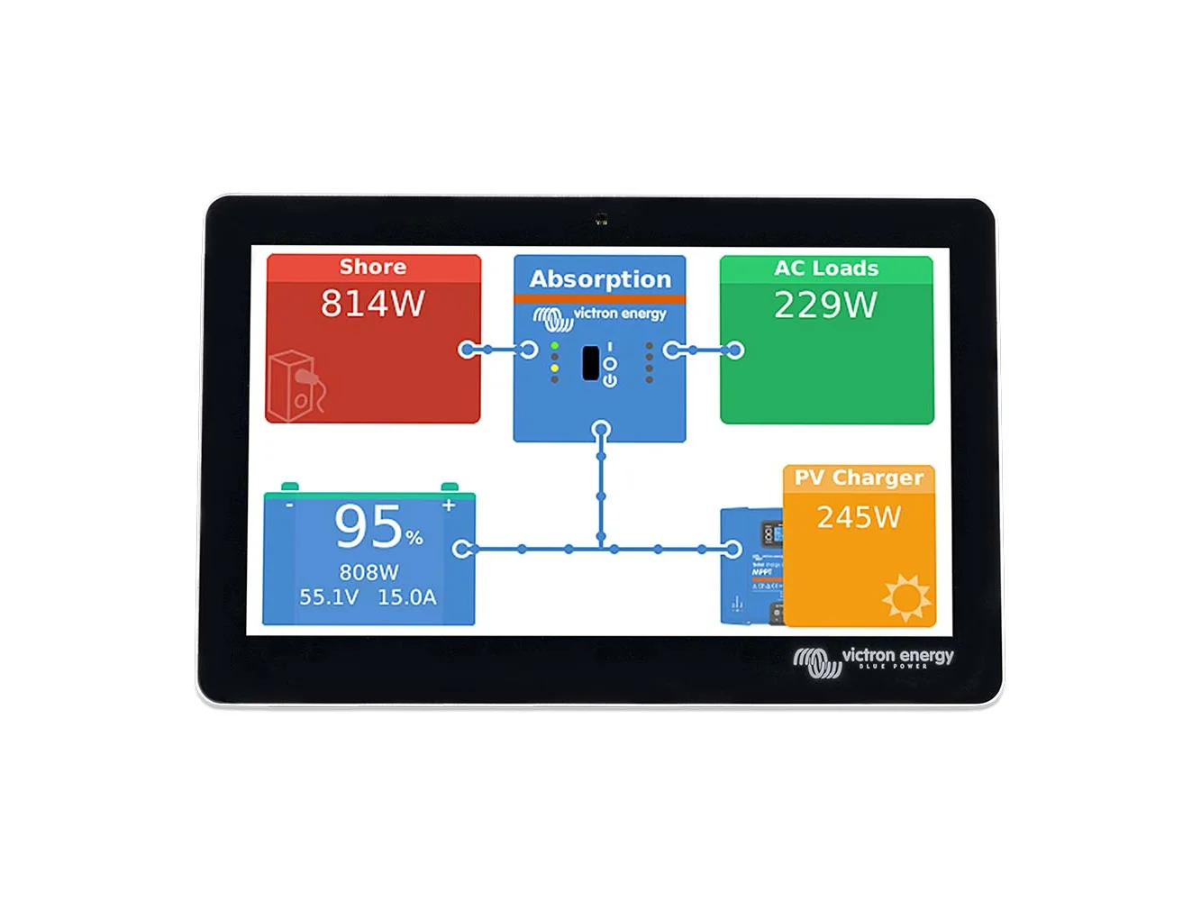 The GX Touch is optimized to more than meet the standards of installer professionals. The screen is simply bolted on top of a dashboard, eliminating the need to create perfect cut-outs (like with the Color Control GX). It can also be mounted flush or even embossed with the unlaying surface and connected through just one cable, taking away the hassle of having to bring many wires to a dashboard.