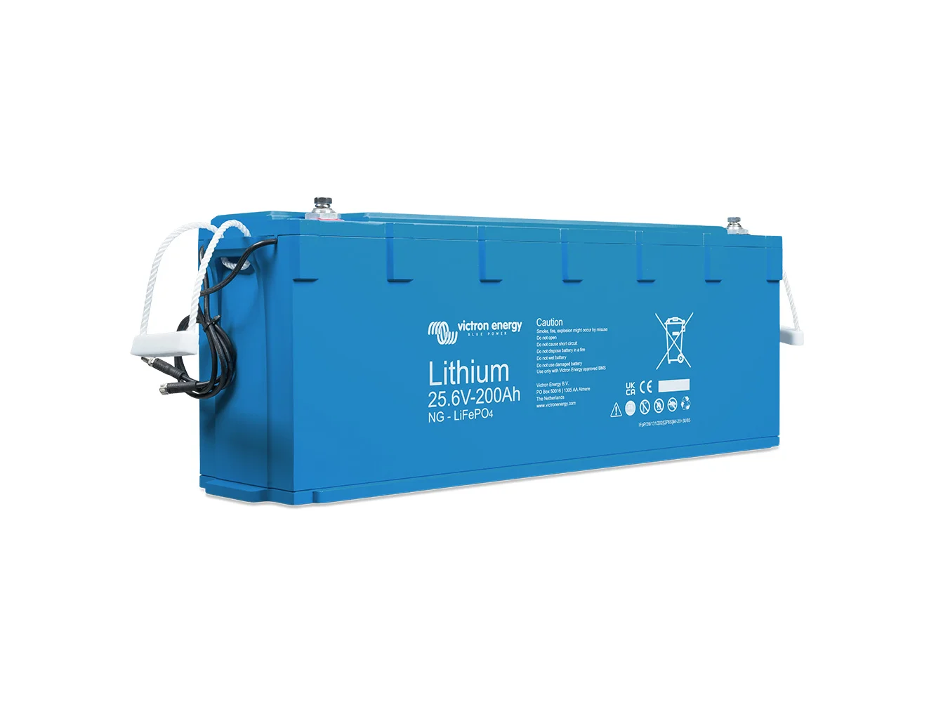 Victron Energy Lithium NG batteries are Lithium Iron Phosphate (LiFePO4 or LFP) batteries available in various capacities with nominal voltages of 12.8V, 25.6V, and 51.2V. They can be connected in series, parallel, and series/parallel so that a battery bank can be built for system voltages of 12V, 24V, or 48V. The maximum number of batteries in one system is 50, which results in a maximum energy storage of 192kWh in a 12V system and up to 384kWh in a 24V and 48V system.