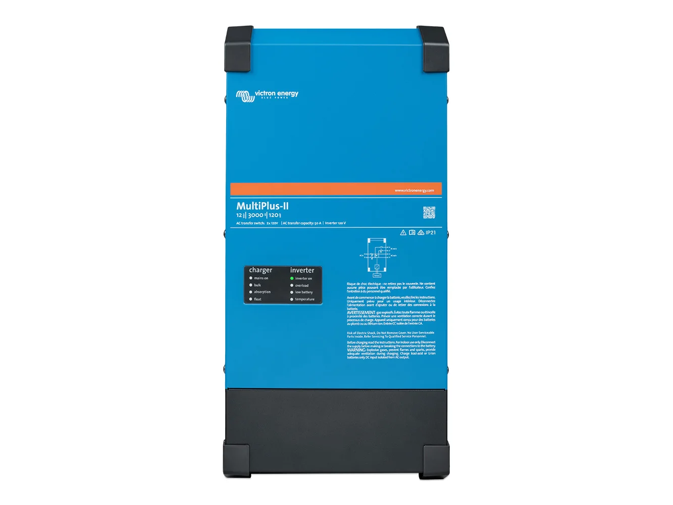 The MultiPlus-II is a multifunctional inverter/charger with two AC outputs. Suitable for professional marine, yachting, vehicle, and land-based off-grid systems, it also provides the isolation and redundancy required for ESS setups. PowerControl allows the MultiPlus-II to prevent grid or generator overload, while PowerAssist boosts AC power during peak demand. In the event of an outage, the inverter switches over in milliseconds, keeping computers and sensitive electronics running without interruption. The battery charger combines speed with efficiency through a smart adaptive algorithm that extends battery life. Ready for expansion, the MultiPlus-II supports parallel and three-phase configurations when a system needs to scale.