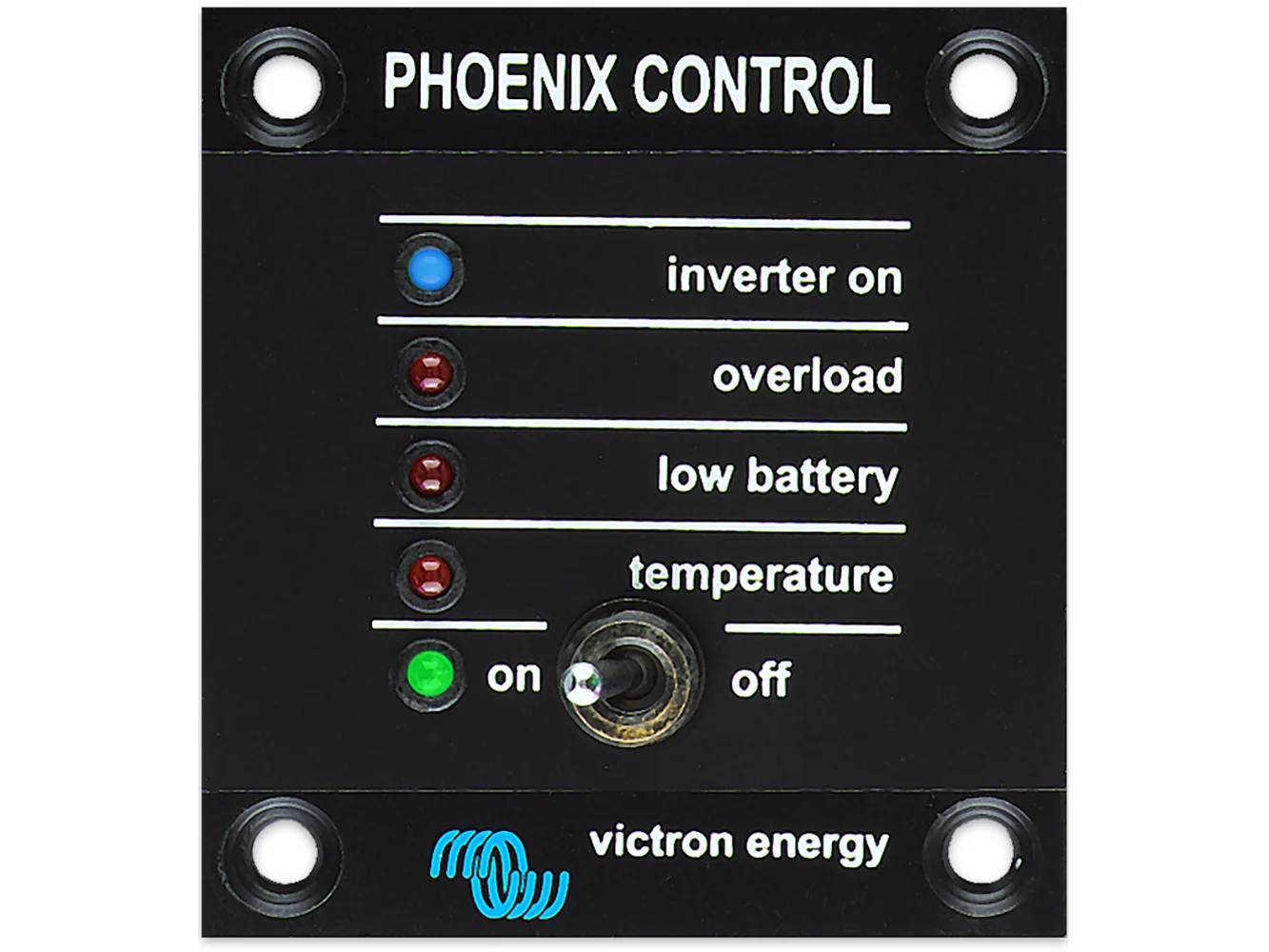 This panel is intended for VE.BUS Phoenix Inverters equipped with a UTP remote monitoring and control socket. It can also be used on a MultiPlus Inverter/Charger when an automatic transfer switch but no charger function is desired. The brightness of the LEDs is automatically reduced during night time. A UTP cable is required to connect the panel to the inverter. Only for models: 12/1200, 12/1600, 12/2000, 12/3000, 12/5000, 24/1200, 24/1600, 24/2000, 24/3000, 24/5000, 48/3000 and 48/5000.