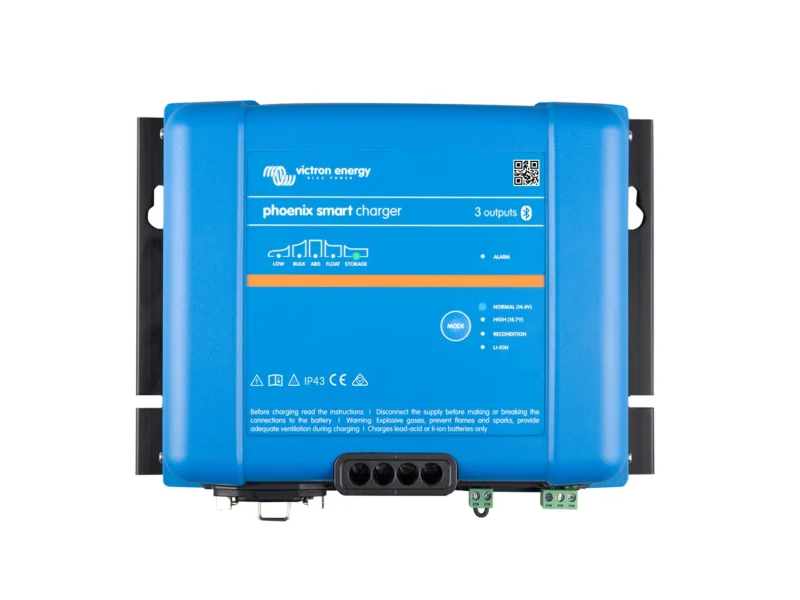 - Optional external battery voltage and temperature sensing via Bluetooth: A Smart Battery Sense or a BMV-712 Smart Battery Monitor can be used to communicate battery voltage and temperature to one or more Phoenix Smart IP43 Chargers.