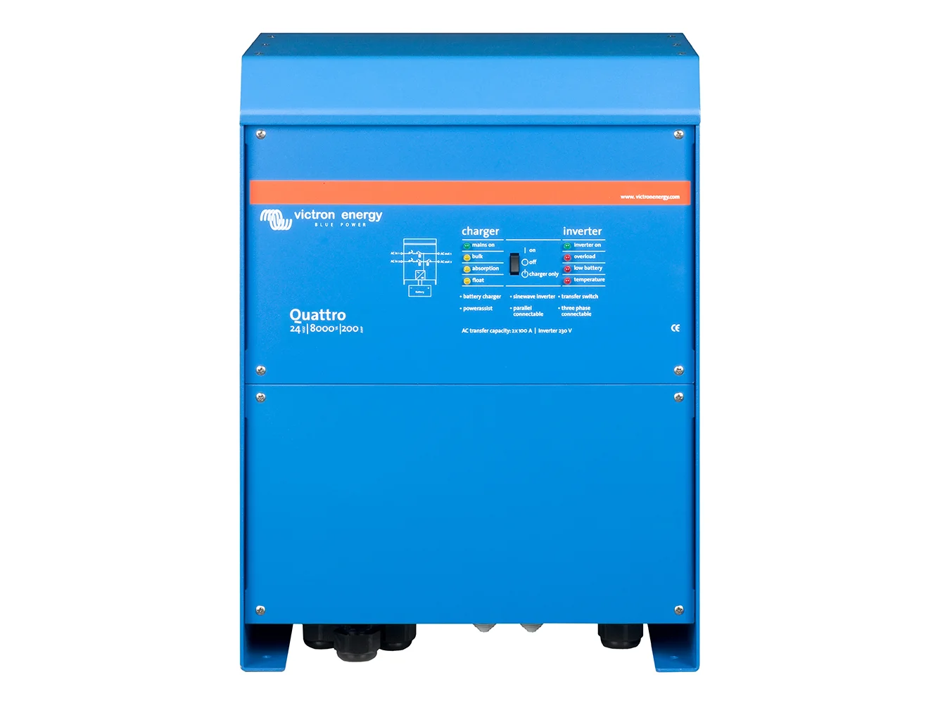 Similar to the MultiPlus, the Quattro is also a combined inverter and charger. Additionally, it can accept two AC inputs and automatically connect to the active source. Its many features include a true sine wave inverter, adaptive charging, hybrid PowerAssist technology plus multiple systems integration features such as three or split-phase operation and parallel operation.