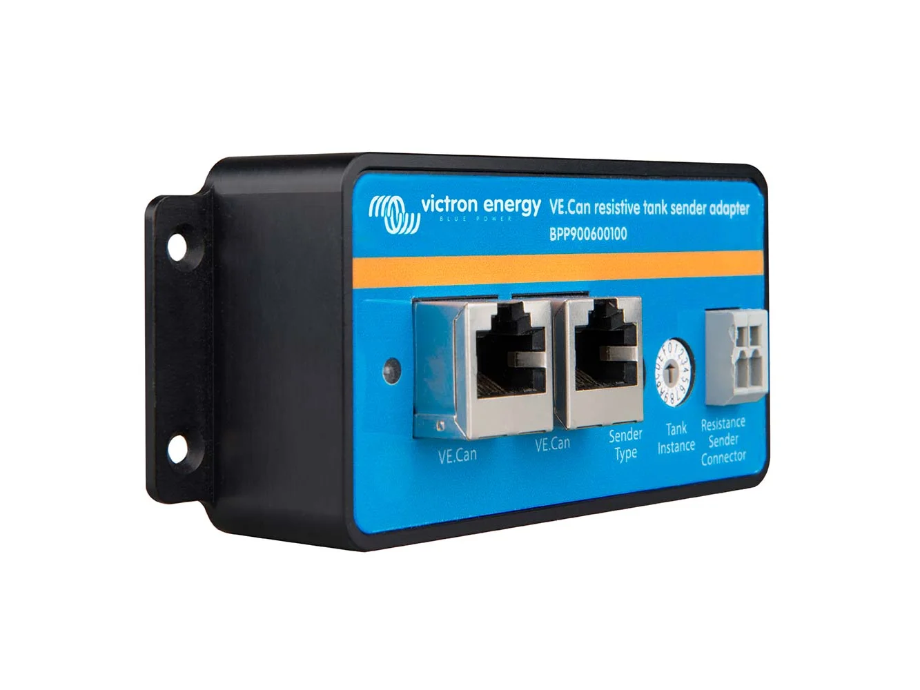 The VE.Can resistive tank sender adapter allows a standard resistive tank level sender to connect to the Color Control GX. It is compatible with both European standard 0-180 Ohm and United States standard 240-30 Ohm tank level senders and is accurate to ±1%. It is easily configurable to resistive senders from fuel, freshwater, wastewater, well water, oil, and black water (sewage) tanks. It supports up to 16 tanks of each type. The unit is a simple setup with two small rotary switches and it gets its power from the VE.Can network.