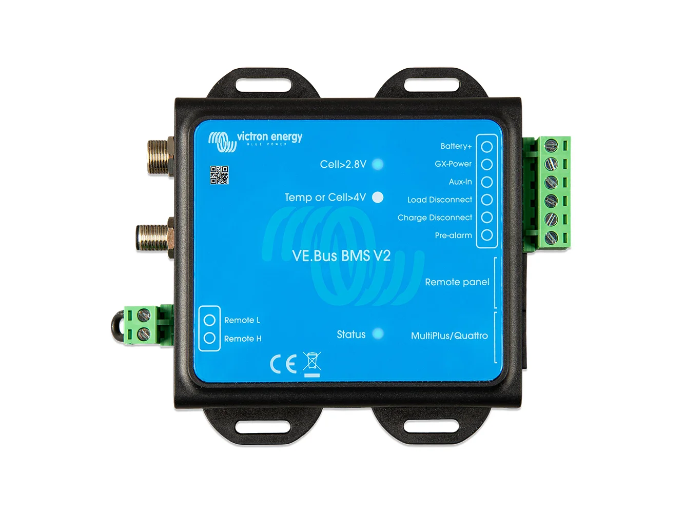 The VE.Bus BMS and VE.Bus BMS V2 is Battery Management System (BMS) designed to interface with and protect a single or multiple Victron Lithium Battery 12,8V & 25,6V Smart (LiFePO4 or LFP) in systems that have Victron inverters or inverter/chargers with VE.Bus communication. It monitors and protects the batteries against the over voltage and under voltage of any individual cell, and also over temperature or under temperature conditions.