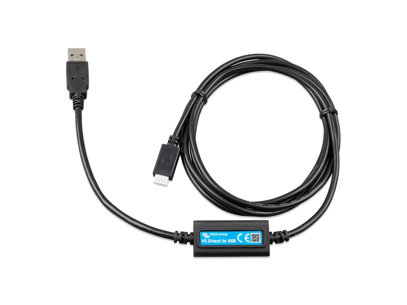The VE.Direct to USB interface connects products with a VE.Direct connection to devices with a USB port, for example, a computer. With this cable, it is also possible to connect more than two VE.Direct products to a single CCGX. Measures 70.5" in length; 5' 10".