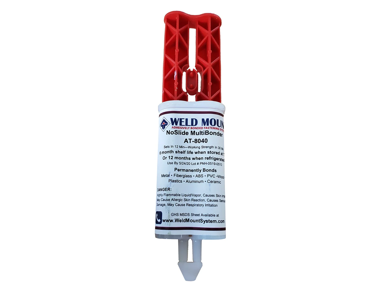 AT-8040 is a good general-purpose adhesive packaged in a manual plunger cartridge. Simply snip off the two end caps dispense the needed amount of adhesive onto a clean surface and mix it by hand. AT-8040 cures in 10-12 minutes, has a 6-minute working time and develops working strength in 40 minutes. AT-8040 has a 12-month shelf life when stored at 72°. Weld Mount recommends that wherever possible this adhesive be refrigerated. Packaged in a 30ml cartridge this adhesive does not require the adhesive gun or mixing tips. The 30ml cartridge will bond 30-50 parts.