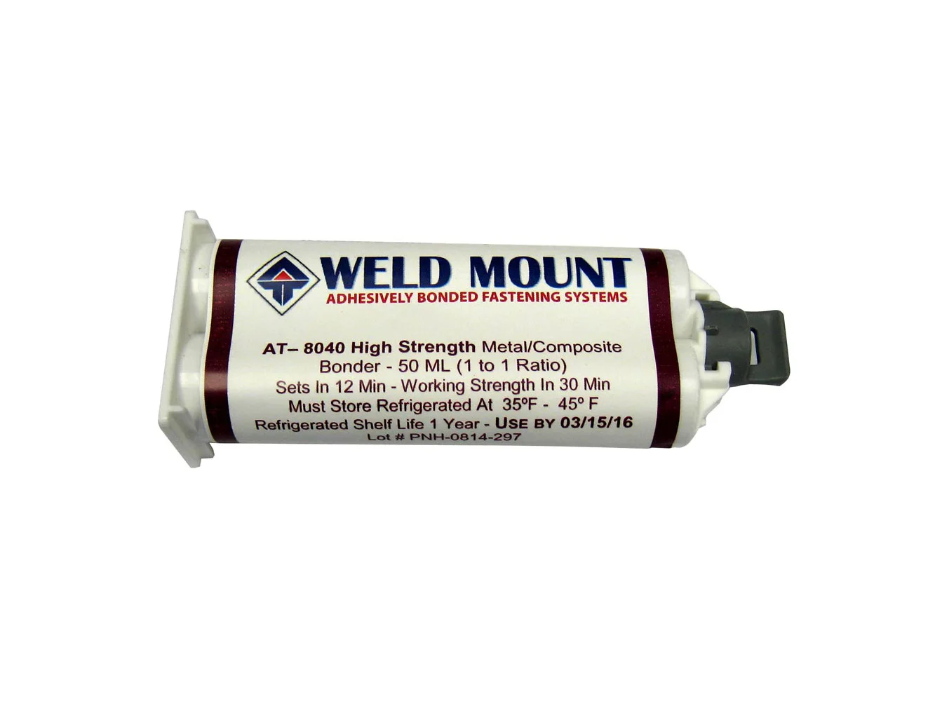 Weld Mount AT-8040 is a solvent free, VOC Compliant, two part methacrylate-based, structural adhesive formulated to bond metals for use in severe environments. It will also bond engineered thermo- and thermosetting plastics, composites to metals or various substrate combinations. It has excellent adhesion to as received metal surfaces including aluminum, stainless steel, galvanized steel, and plated steels. AT-8040 forms a tough, high strength bonds usually with minimal surface preparation developing handling strength in 12 minutes and a functional cure within 45 minutes. Ultimate strength exceeds 3500 psi of tensile shear strength on aluminum with remarkable impact and peel strengths. AT-8040 will hold all Weld Mount parts on a vertical or overhead surface without sagging when properly used.