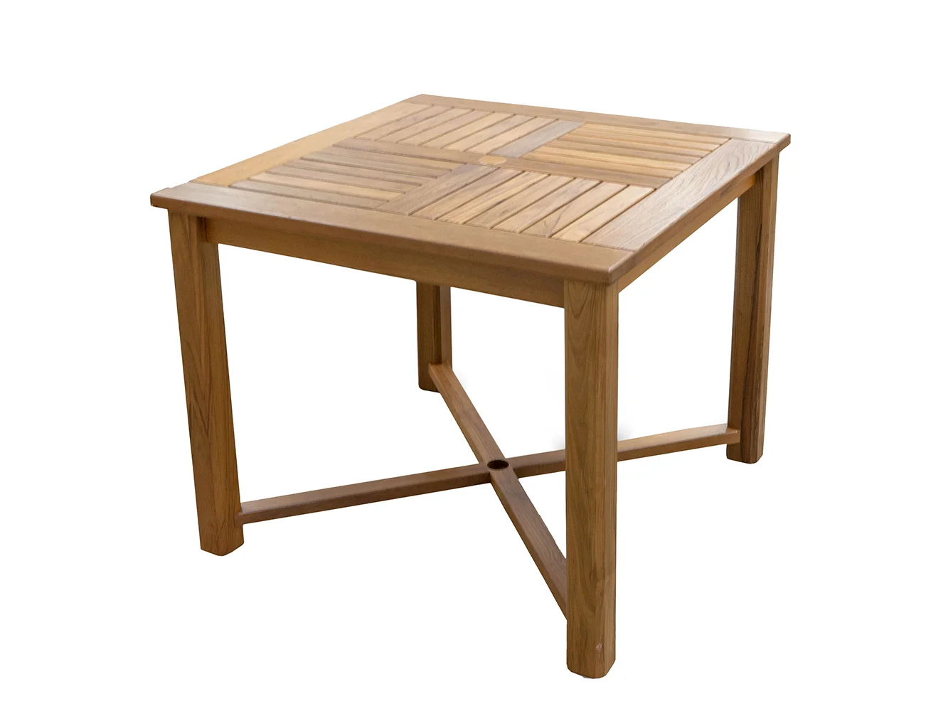 - Solid teak construction. Slat tabletop design. Umbrella hole in the center of the table top, umbrella rest built into the base