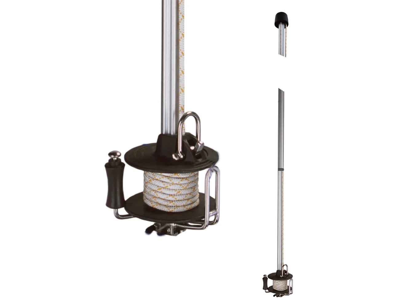 The self-contained halyard passes over a sheave box fitted into the top of the extrusion and returns down to a sheave and cam cleat. Once the sail is hoisted and tensioned, the remaining length of the halyard is used as a furling line.