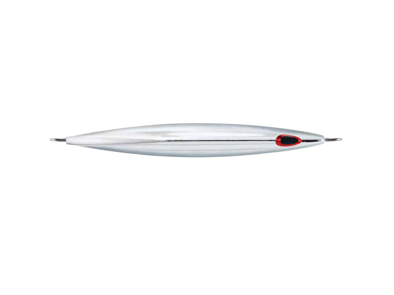 The asymmetrical Kensaki cuts water fast with its knife-tip design, allowing it to get deep. The “in line” eyelets stabilize the jig during descent and enhance the fluttering action under the slack line. Use a ‘lift and fall’ slow-pitch technique to get the Kensaki darting aggressively upwards during the lift, followed by a very tight horizontal flutter on the fall.