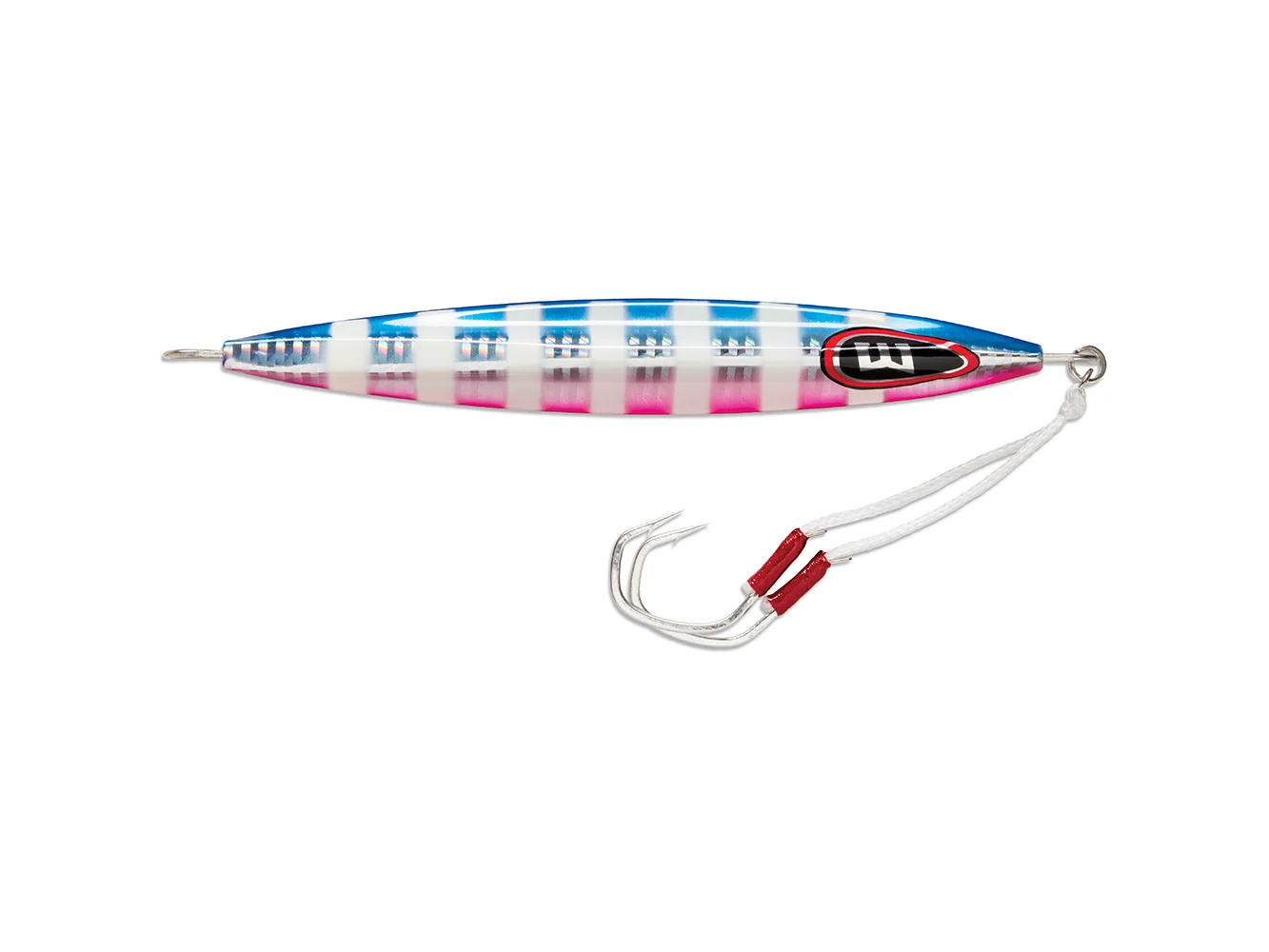 The asymmetrical Kensaki cuts water fast with its knife-tip design, allowing it to get deep. The "in line" eyelets stabilize the jig during descent and enhance the fluttering action under the slack line. Use a ‘lift and fall’ slow-pitch technique to get the Kensaki darting aggressively upwards during the lift, followed by a very tight horizontal flutter on the fall.